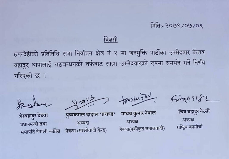 काठमाडौँ । रूपन्देही २ मा जनमुक्ति पार्टीका उम्मेदवार केशवबहादुर थापालाई गठबन्धनले समर्थन गर्ने भएको छ ।