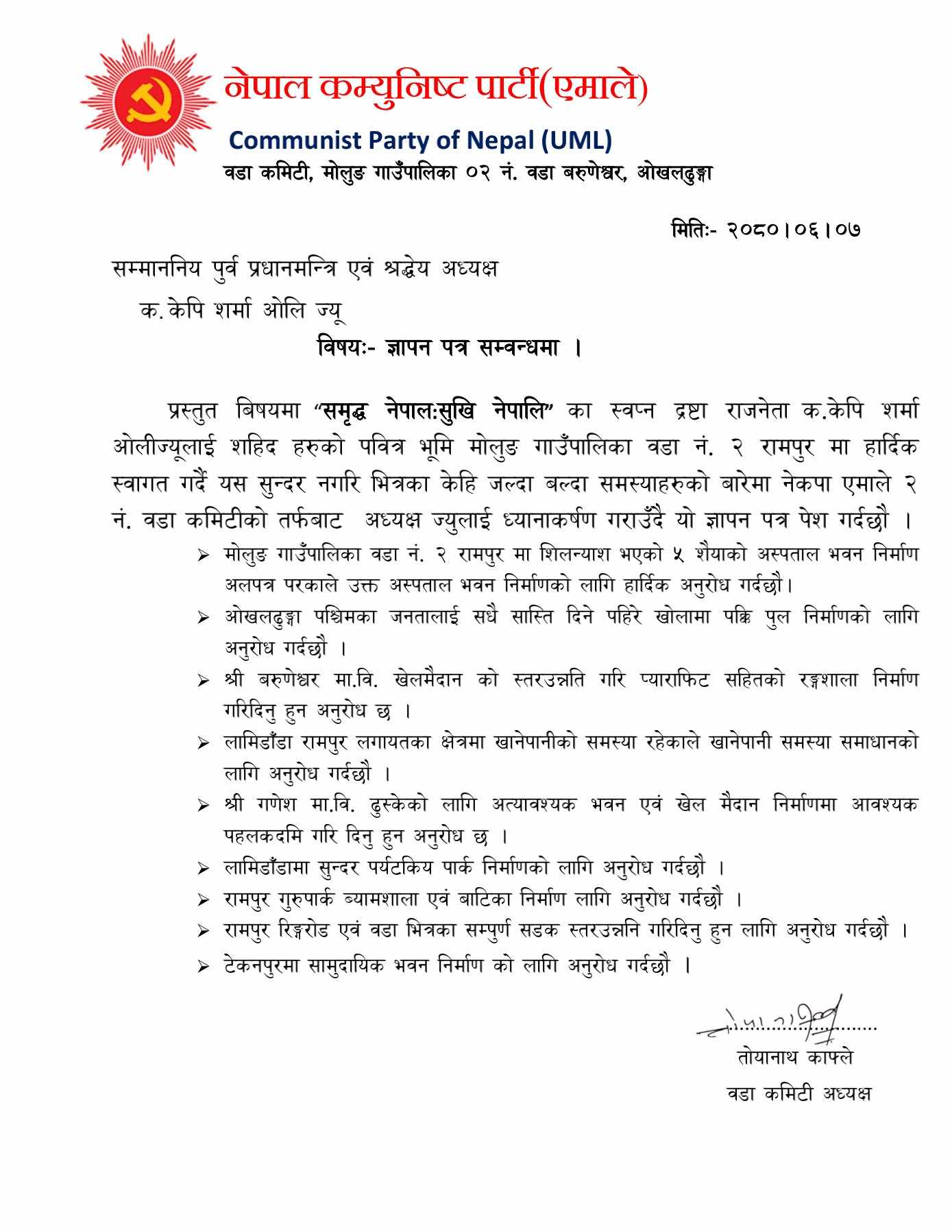 ओखलढुंगा । नेकपा एमाले मोलुंग गाउँपालिका वडा नम्बर २ कमिटीले वडाको समग्र बिकासका निम्ति बिभिन्न माग सहित नेकपा एमालेका अध्यक्ष एबम पुर्व प्रधानमंत्री केपि शर्मा ओलीलाई ज्ञापन पत्र बुझाएको छ।वडा कमिटी अध्यक्ष तोया काफ्लेद्वारा हस्ताक्षरित उक्त ज्ञापनपत्रमा ओखलढुङ्गा पश्चिमका जनतालाई सधै सास्ति दिने पहिरे खोलाको पुल निर्माण लगायत बिबिध मागहरु उल्लेख गरिएको छ।