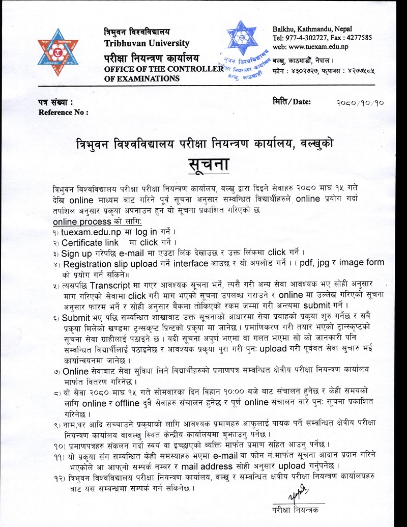 काठमाडौ । त्रिभुवन विश्वविद्यालयले आजदेखि ट्रान्सक्रिप्टलगायत सेवा अनलाइनबाटै दिने भएको छ । त्रिविको माघ २ गते बसेको केन्द्रीय परीक्षा सञ्चालक समितिको बैठकले आजदेखि ट्रान्सक्रिप्ट, प्रोभिजनल प्रमाणपत्र, पुनर्योग, प्रतिलिपि, करेक्सनलगायत सेवा अनलाइनबाट दिने निर्णय गरेको थियो ।