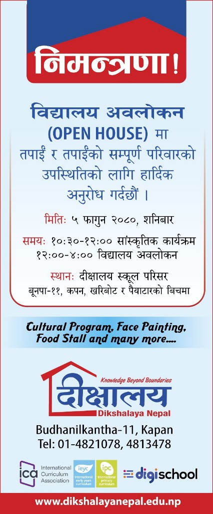 बुढानीलकण्ठ । काठमाडौँको बुढानीलकण्ठ ११ कपन, खरिबोट पैयाँटारको बीचमा रहेको दीक्षालय स्कुलले विद्यालय अवलोकन (Open House) कार्यक्रम गर्ने भएको छ ।