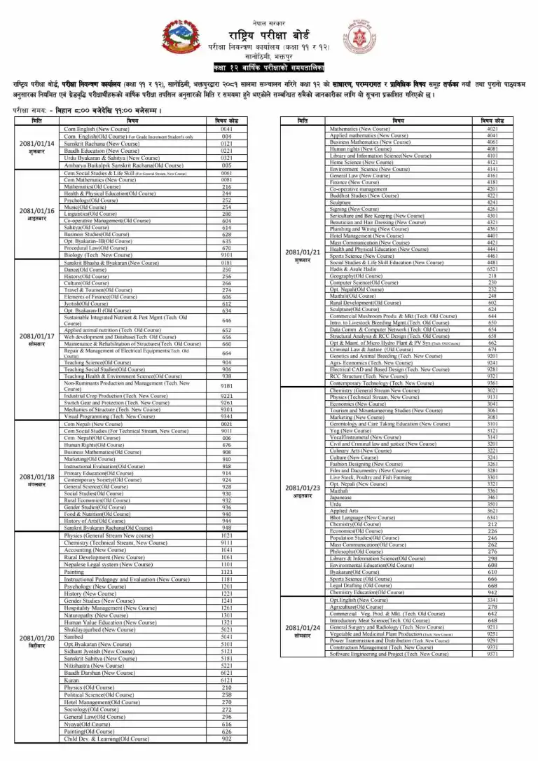 बोर्डले २०८१ साल वैशाख १४ गतेदेखि परीक्षा सुरु हुने तालिका आज सार्वजनिक गरेको हो ।