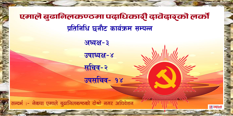 काठमाडौं। यहि चैत्र १६ र १७ गते हुने नेकपा एमाले बुढानिलकण्ठको दोश्रो नगर अधिवेसनका लागि प्रतिनिधि छनौट कार्यक्रम अन्तिम चरणमा पुगेको छ। नगरपालिकाका १३ वडा र बिभिन्न जनबर्गीय संगठनहरुबाट प्रतिनिधि छनौट सकिएको छ भने नगर कमिटीले मनोनित गर्ने केहि संख्यामा प्रतिनिधि मात्र बाँकी छ।