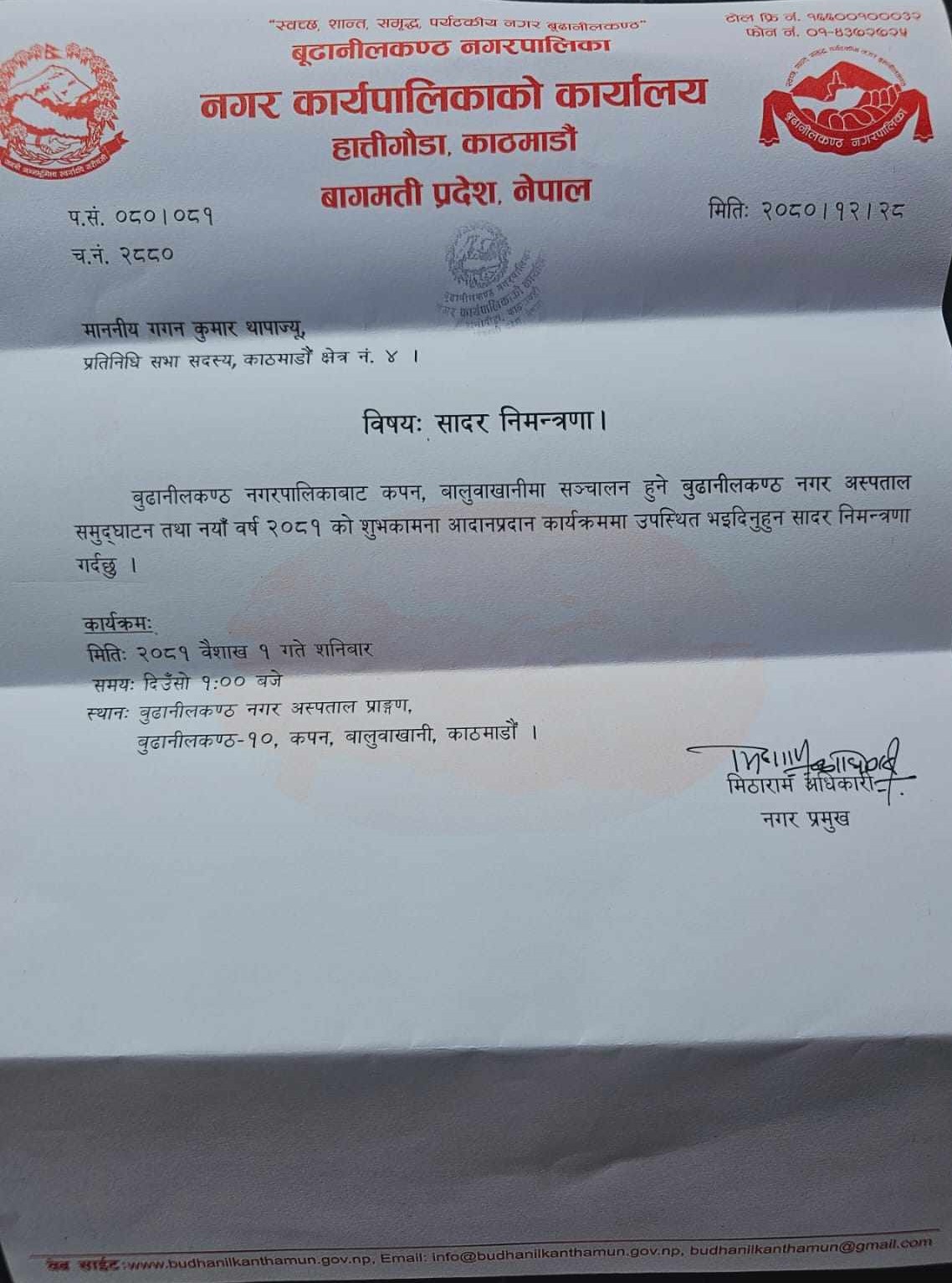 बुढानिलकण्ठ नगरपालिकाका प्रमुख मिठाराम अधिकारीको अध्यक्षतामा भएको कार्यक्रममा बागमती प्रदेशका स्वास्थ्य मन्त्रि , प्रदेश साम्सद जयराम थापा , पुर्व मेयर उद्द्व्व खरेल , बुढानिलकण्ठ नगरपालिकाका उपप्रमुख अनिता लामा लगायतले मन्तब्य राखेका थिए भने कार्यक्रमको संचालन बूढानिलकण्ठ १० का वडाध्यक्ष एबम नगर प्रवक्ता नबराज भट्टराईले गरेका थिए।