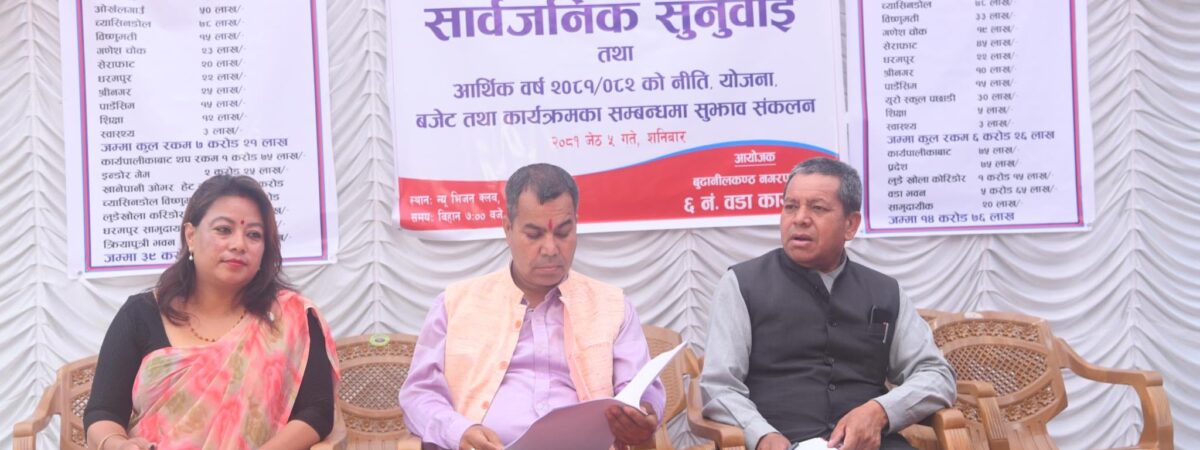 बुढानीलकण्ठ। बुढानीलकण्ठ नगरपालिका वडा नम्बर ६ ले आर्थिक वर्ष २०७९/८० र ०८०।८१ को स्वीकृत वार्षिक कार्यक्रम अनुसार वडाबाट सञ्चालन गरिएका विकास निर्माण, सेवा प्रवाह लगायतका विषयहरुमा सरोकारवाला एवं नगरवासीहरुको जिज्ञासा, प्रतिक्रिया तथा सुझाव लिनका लागि सार्वजनिक सुनुवाई कार्यक्रम सम्पन्न गरेको छ ।