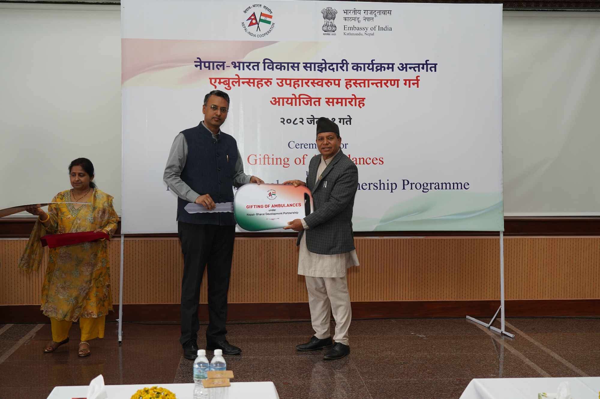 आज भारतीय राजदुतावासमा आयोजित विशेष समारोहमा बुढानिलकण्ठ नगरपालिकाका नगर प्रमुख मिठाराम अधिकारीलाई एम्बुलेन्सको चावी हस्तान्तरण गरिएको थियो।