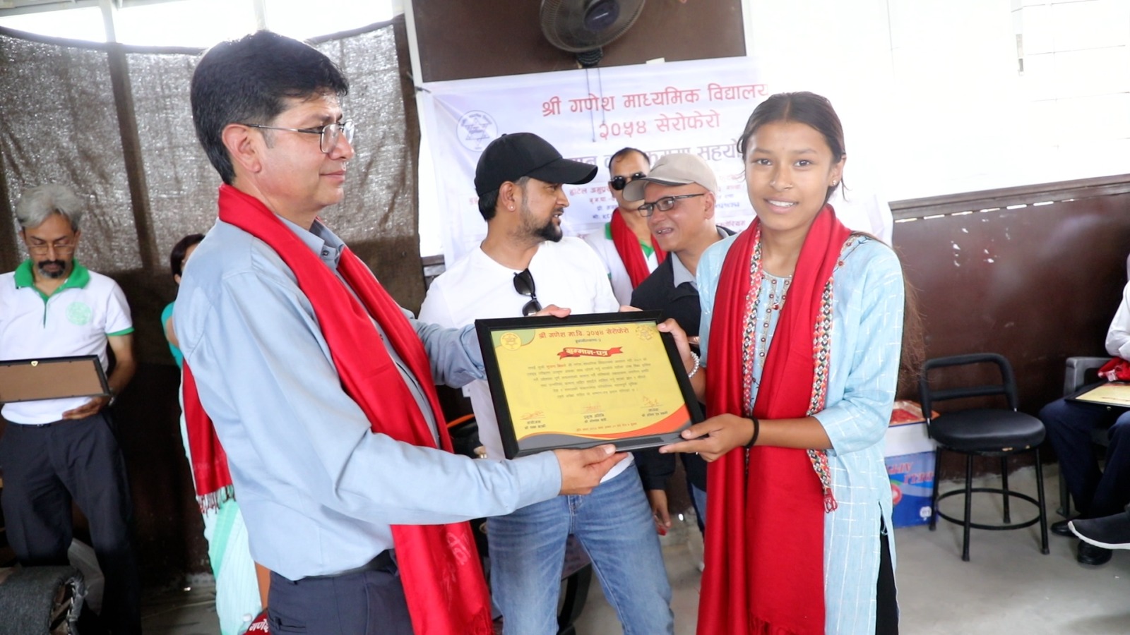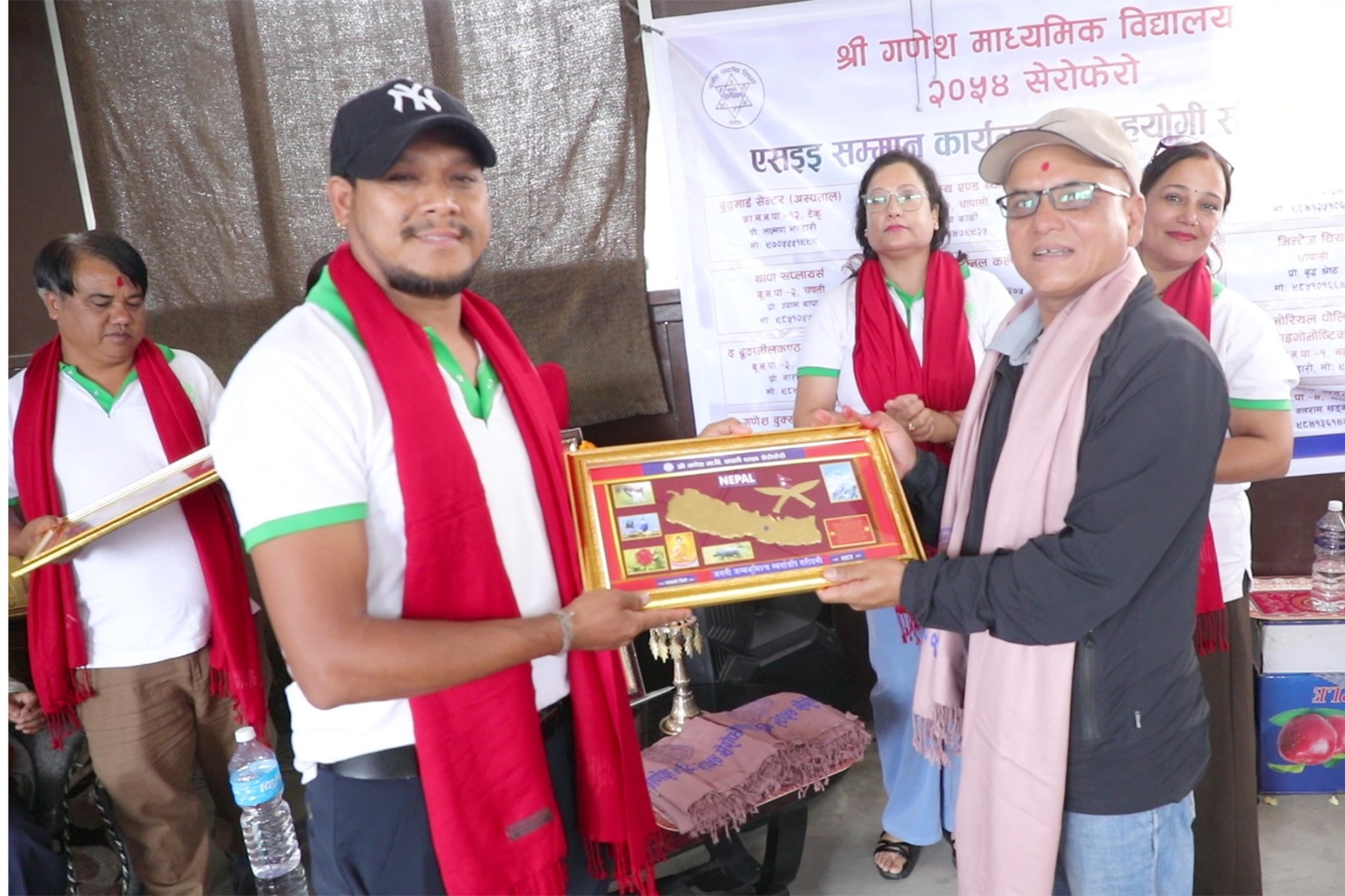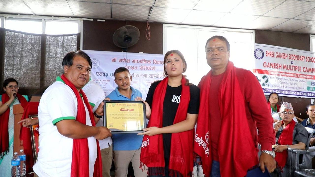काठमाडौं । बुढानीलकण्ठ नगरपालिका वडा नम्बर- २ हात्तीगाैडामा रहेको गणेश माध्यमिक विधालयबाट २०५४ सालमा एसएलसी उत्रिण पुर्व बिधार्थीहरुको संस्था “श्री गणेश मा.बि.२०५४ सेरोफेरो” ले उक्त विधालयबाट २०८१ सालकाे एसईईमा उत्कृष्ट अंक सहित उत्रिण हुन सफल बिद्यार्थीहरू तथा शिक्षकहरुलाई सम्मान कार्यक्रम आयोजना गरेको छ।