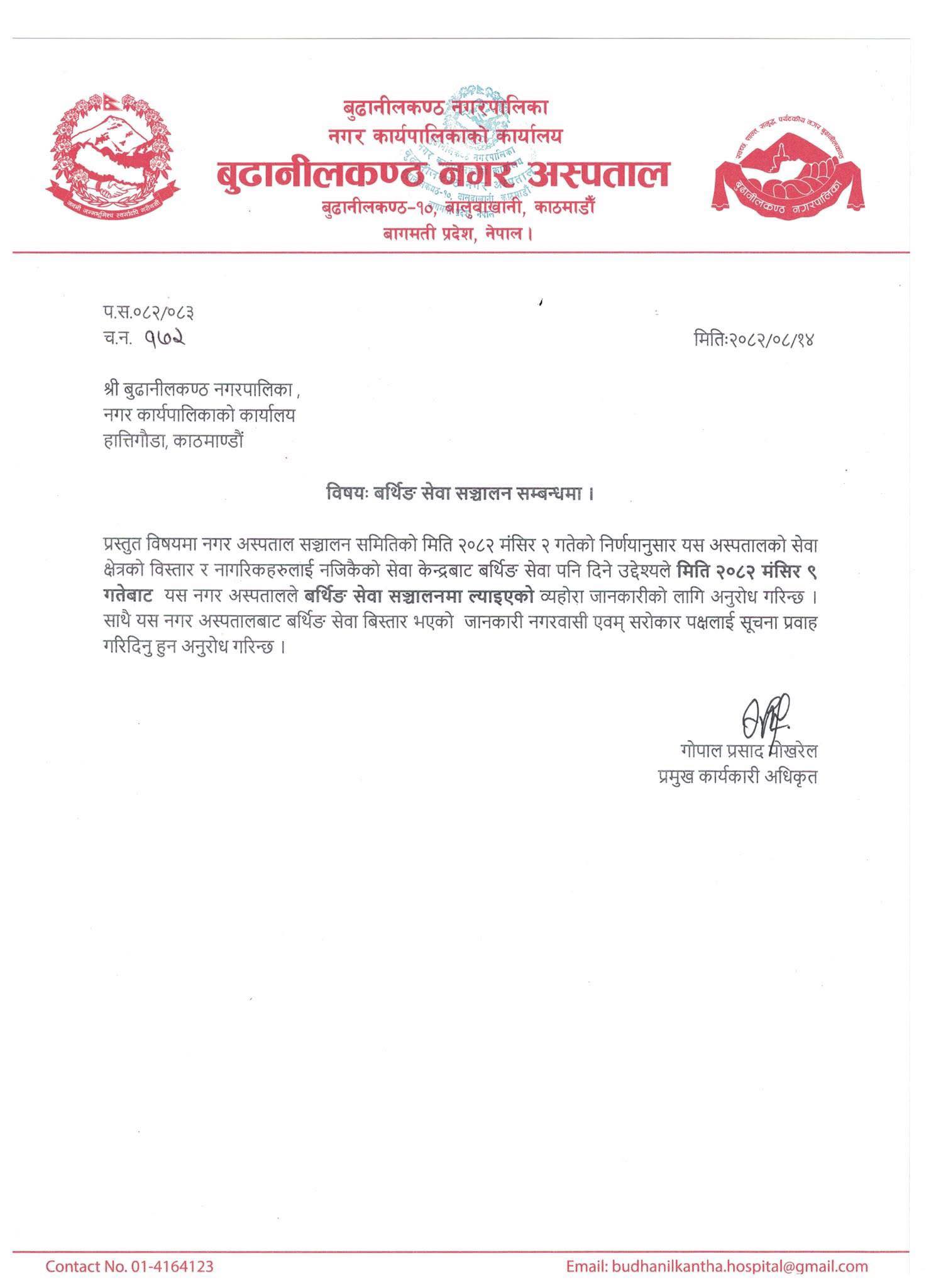 बुढानीलकण्ठ – बुढानीलकण्ठ नगरपालिकाद्वारा संचालित नगर अस्पतालमा बर्थिङ (प्रसूति) सेवा सन्चालनमा आएको छ। बुढानीलकण्ठ नगर अस्पताल सन्चालन समितिको मंसिर २ गतेको निर्णयअनुसार अस्पतालको सेवा क्षेत्र विस्तार गर्दै मंसिर ९ गतेदेखि औपचारिक रूपमा बर्थिङ (प्रसूति) सेवा सन्चालनमा ल्याइएको जानकारी नगरपालिकाले दिएको छ।
