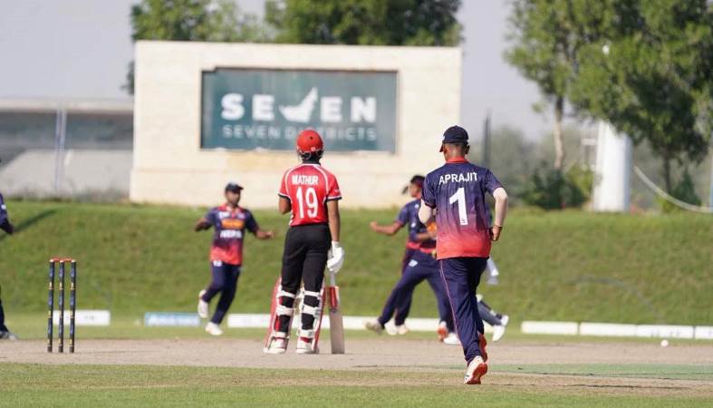 यसअघि अजमानस्थित करवान मैदानमा टस हारेर पहिला ब्याटिङ गरेको आयोजक यूएई ४५ दशमलव पाँच ओभरमा १४७ रनमा अलआउट भयो । जसमा अहमद खुदादादले सर्वाधिक ७१ रन जोडे । नेपालका दयानन्द मण्डलले छ, अपराजित पौडलले दुई, कप्तान अशोक धामी र नितेसकुमार पटेलले एक-एक विकेट लिए ।