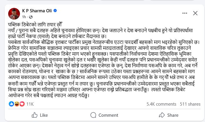 काठमाडौं । नेकपा एमालेका अध्यक्ष केपी शर्मा ओलीले चुनाव केन्द्रित पब्लिक डिबेट (सार्वजनिक बहस) का लागि आफू तयार रहेको बताएका छन् ।
