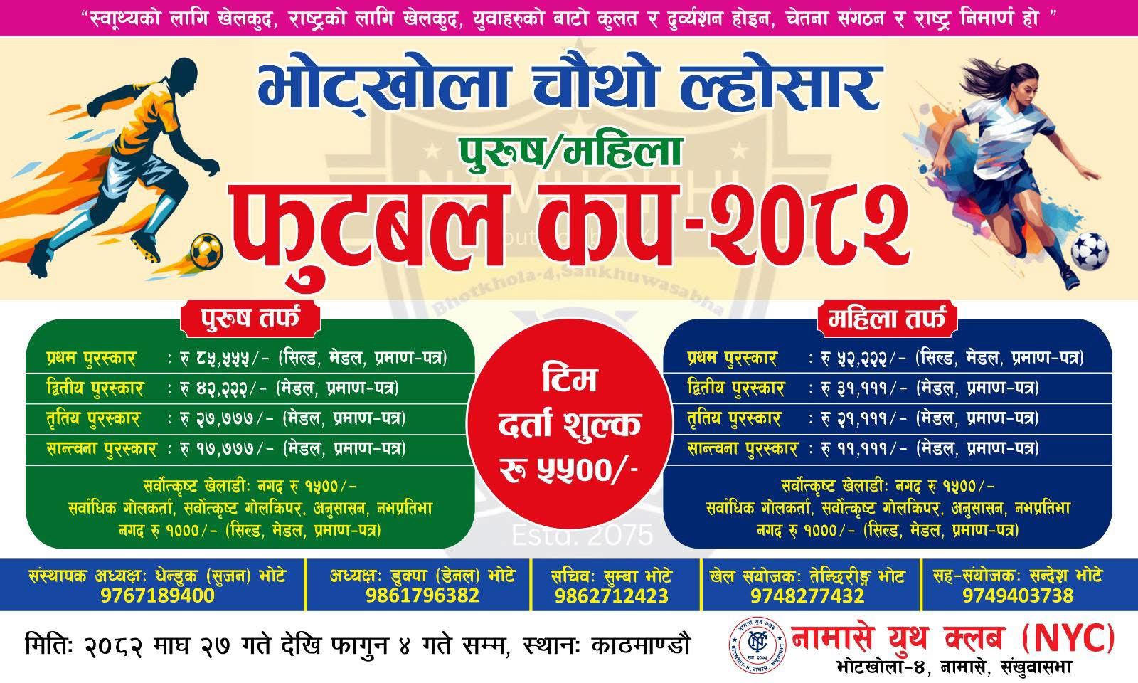 काठमाडौं। भोटखोला, नामासे संखुवासभामा स्थायी ठेगाना भएका सक्रिय युवाहरुले नेतृत्व गरिरहेको नामासे युथ क्लब (NYC) ले चौथो ल्होसार कप पुरुष / महिला फुटबल प्रतियोगिता आयोजना गरेको छ। यही माघ २७ गते देखि फागुन ४ गते सम्म काठमाडौंको बुढानिलकण्ठ १० स्थित कपन आकाशेधारा ह्याण्डबल ग्राउण्डमा प्रतियोगिता संचालन भैरहेको छ।