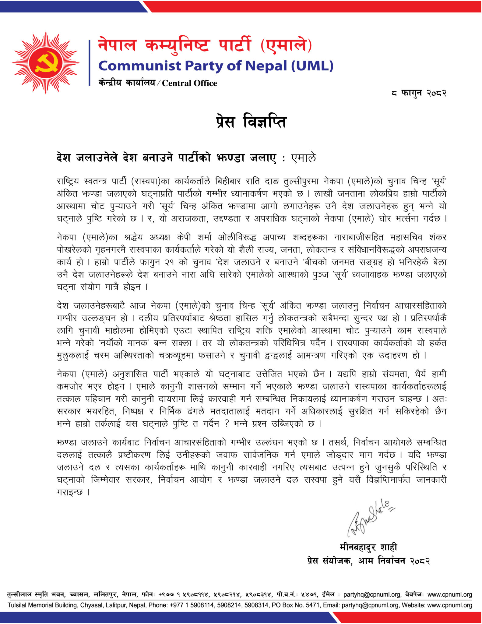 विज्ञप्तिमा देश जलाउने गतिविधिमा संलग्न शक्तिबाटै एमालेको चुनाव चिह्न ‘सूर्य’ अंकित झण्डा जलाइनु निर्वाचन आचारसंहिताको गम्भीर उल्लंघन भएको उल्लेख गरिएको छ।